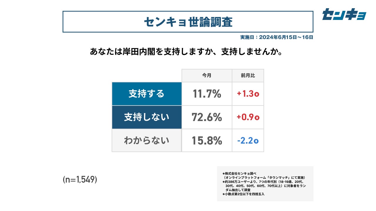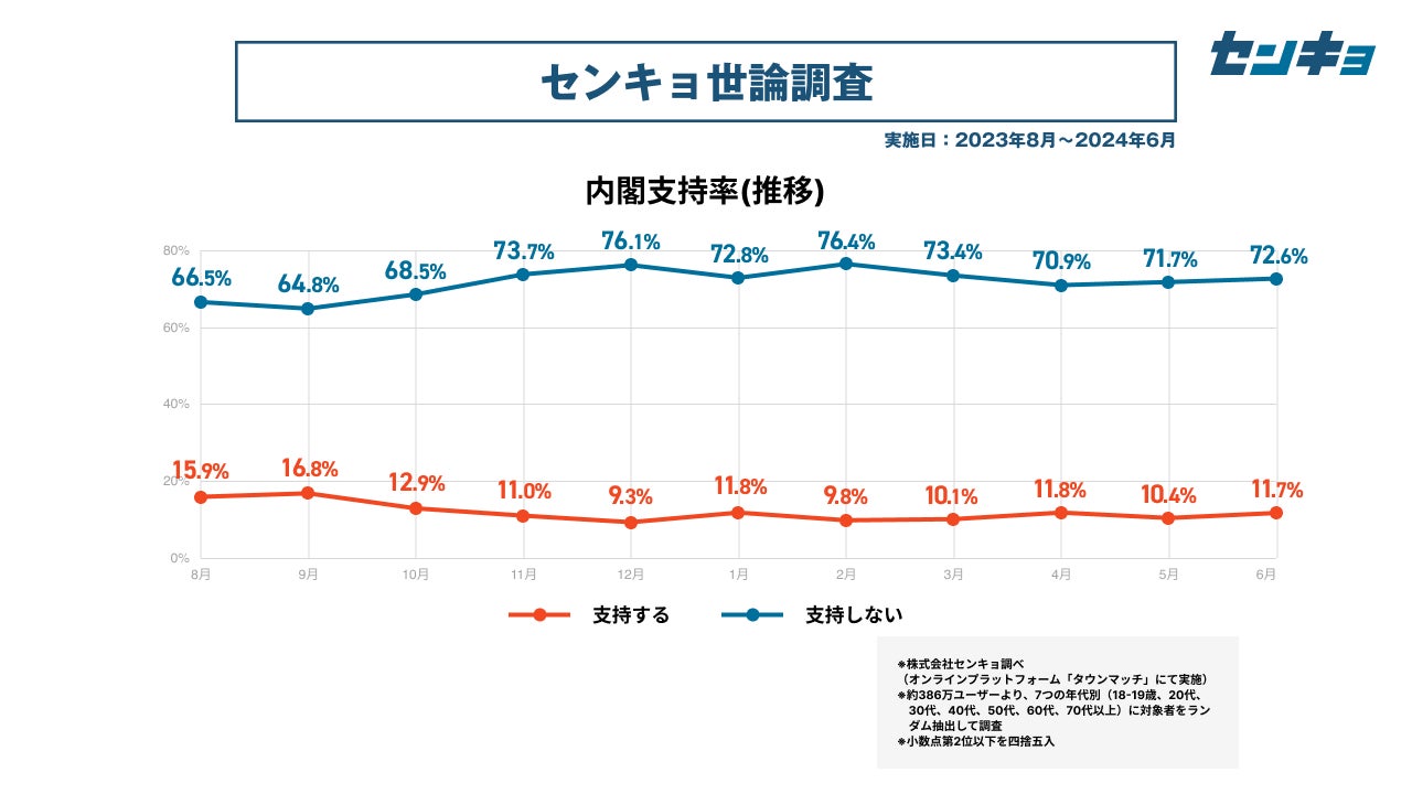 【株式会社センキョ】タウンマッチ定期世論調査、6月の内閣支持率は11.7%