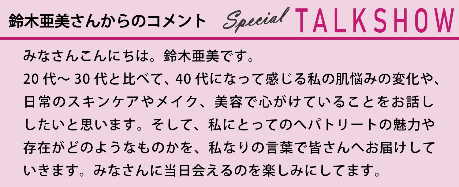 また、10月20日(日)16時30分から、有楽町マルイ3F STUDIO O1にて、タレントの鈴木亜美さんによるスペシャルトークショーを開催。日頃のスキンケアや美しさを保つ秘訣などたっぷりお話しいただきます。トークショーは抽選受付となりますので、参加をご希望される場合は、下記の応募フォームからお申し込みください。