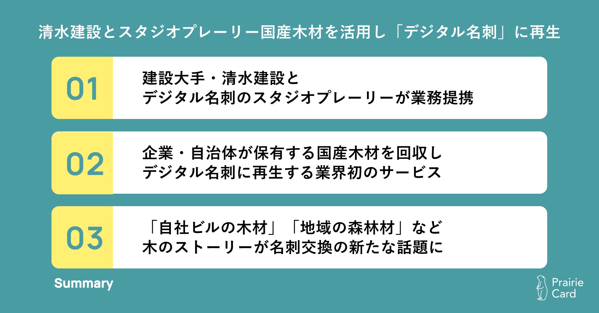 デジタル名刺「プレーリーカード」を展開する株式会社スタジオプレーリー(本社:東京都渋谷区、https://prairie.cards/ )は、清水建設株式会社(本社:東京都中央区、以下「清水建設」)と業務提携を結び、企業や自治体から提供される木材を活用してデジタル名刺の製造を行う「プレーリーカード・Re:Wood powerd by清水建設株式会社」のサービス提供を開始いたしました。