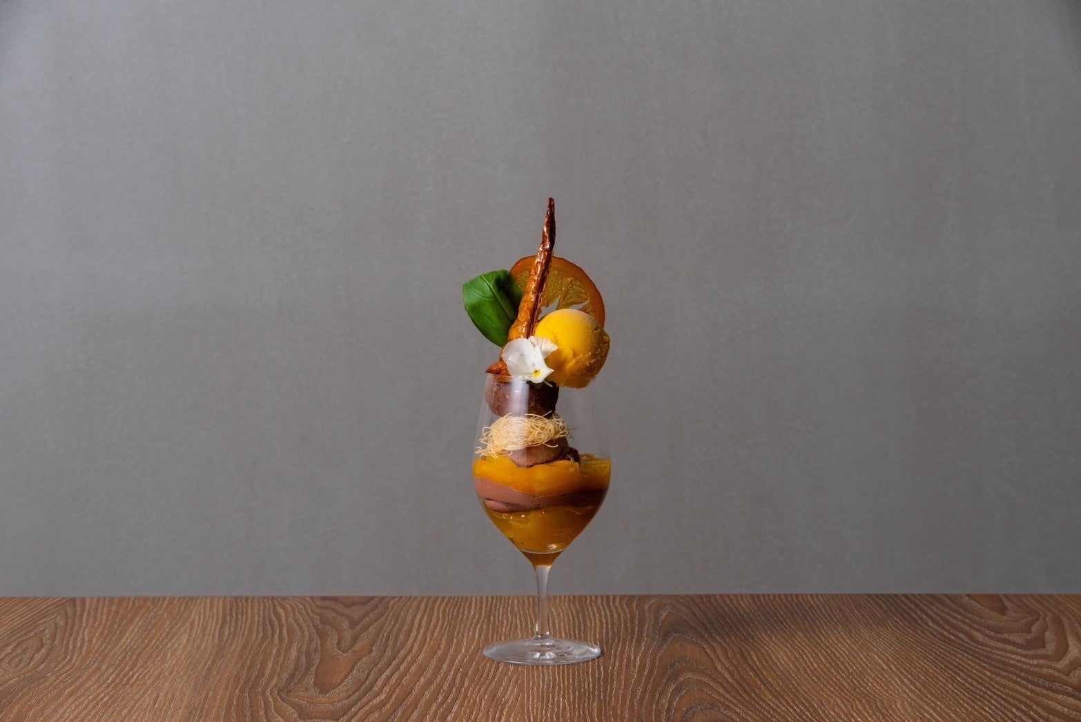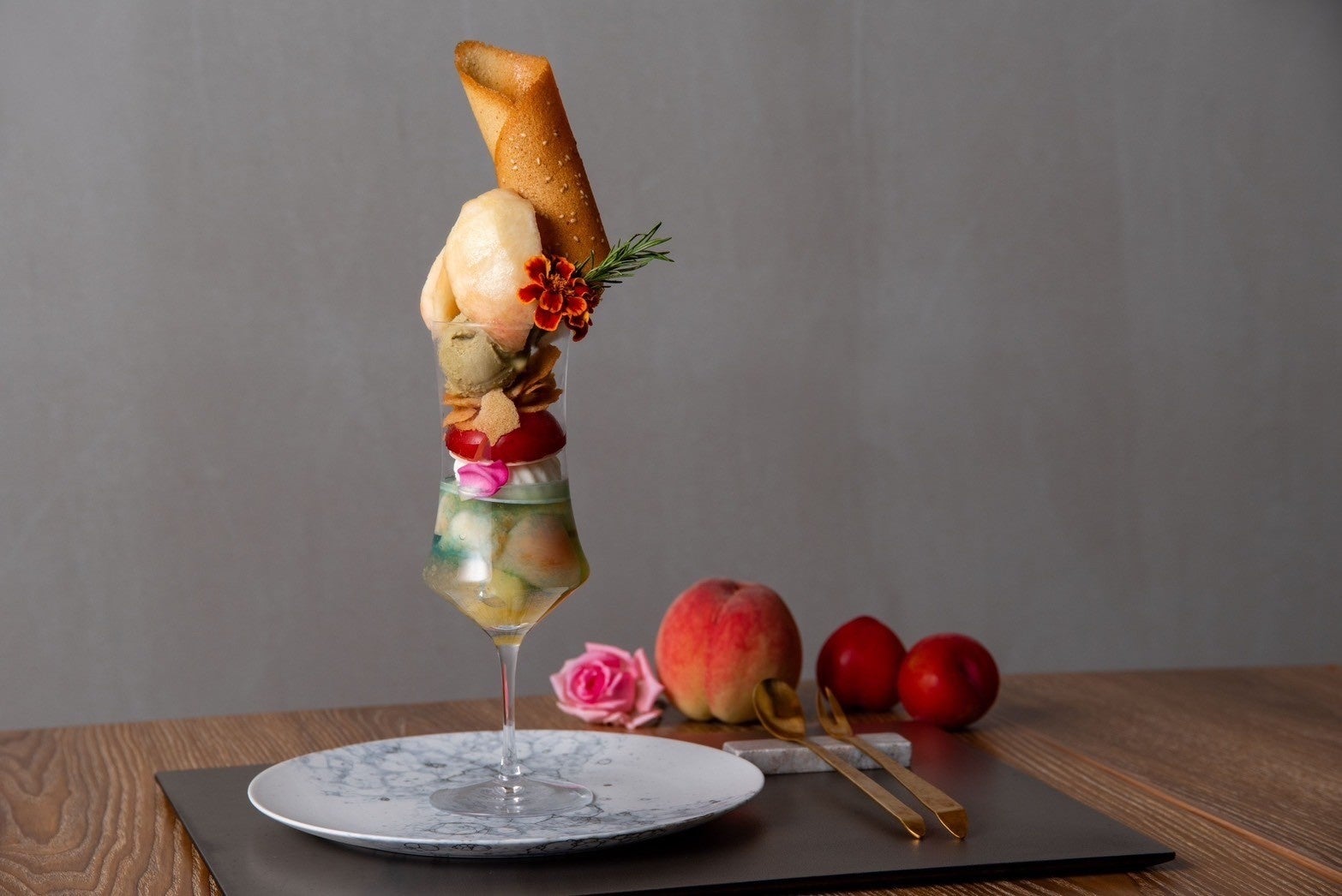 旬の桃を贅沢に使ったラグジュアリーパフェ。桃の果実そのままを始め、桃とバジルのジェラート、山椒と桃のプリン、桃のコンポート、桃のジュレなど、桃の素材を様々なデザートにして層状に組み合わせています。