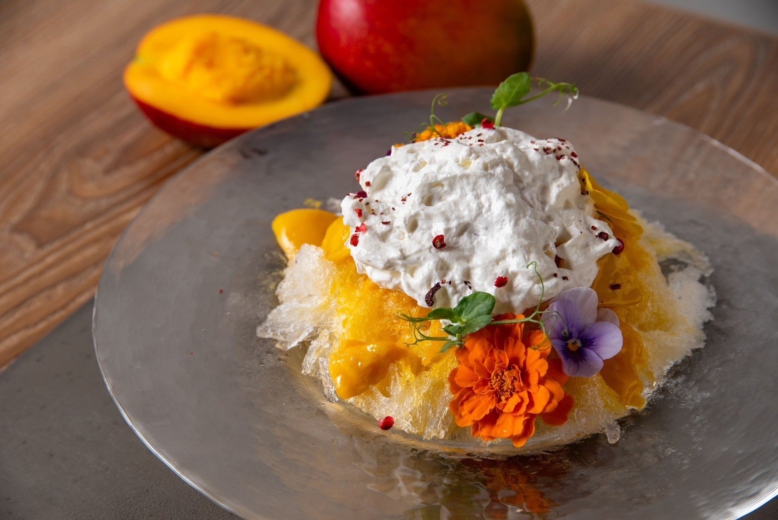 ヨーグルトのエスプーマ、マンゴーソースのほか、甘く煮詰めた生姜コンポート、スマックやレッドペッパーなどのスパイスをトッピング。彩り鮮やかなエディブルフラワーとマイクロハーブを添えて見た目にも夏らしいラグジュアリーなかき氷に仕上げました。