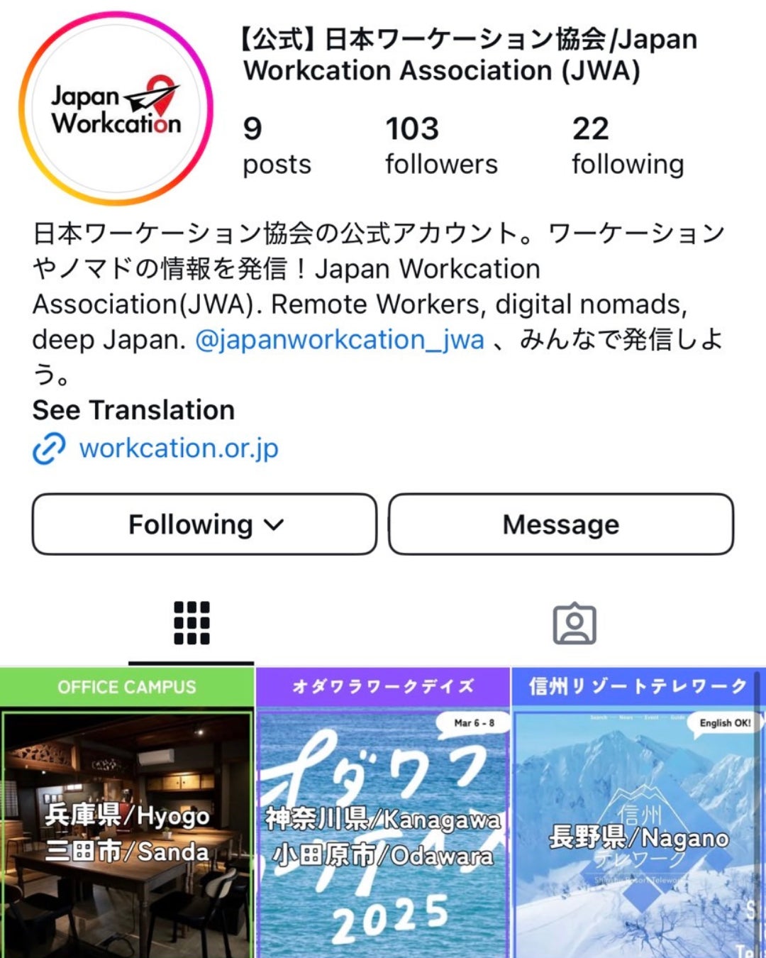 また本アカウントをメンションしてストーリーズで発信いただければ、基本は公式サイトから返信させていただきます。本アカウントを通して、より多くの方に国内外のワーケーションやノマドライフ、イベントの様子、色々な地域やライフスタイルのリアルな情報を得ていただくことをねらいいとしております。
