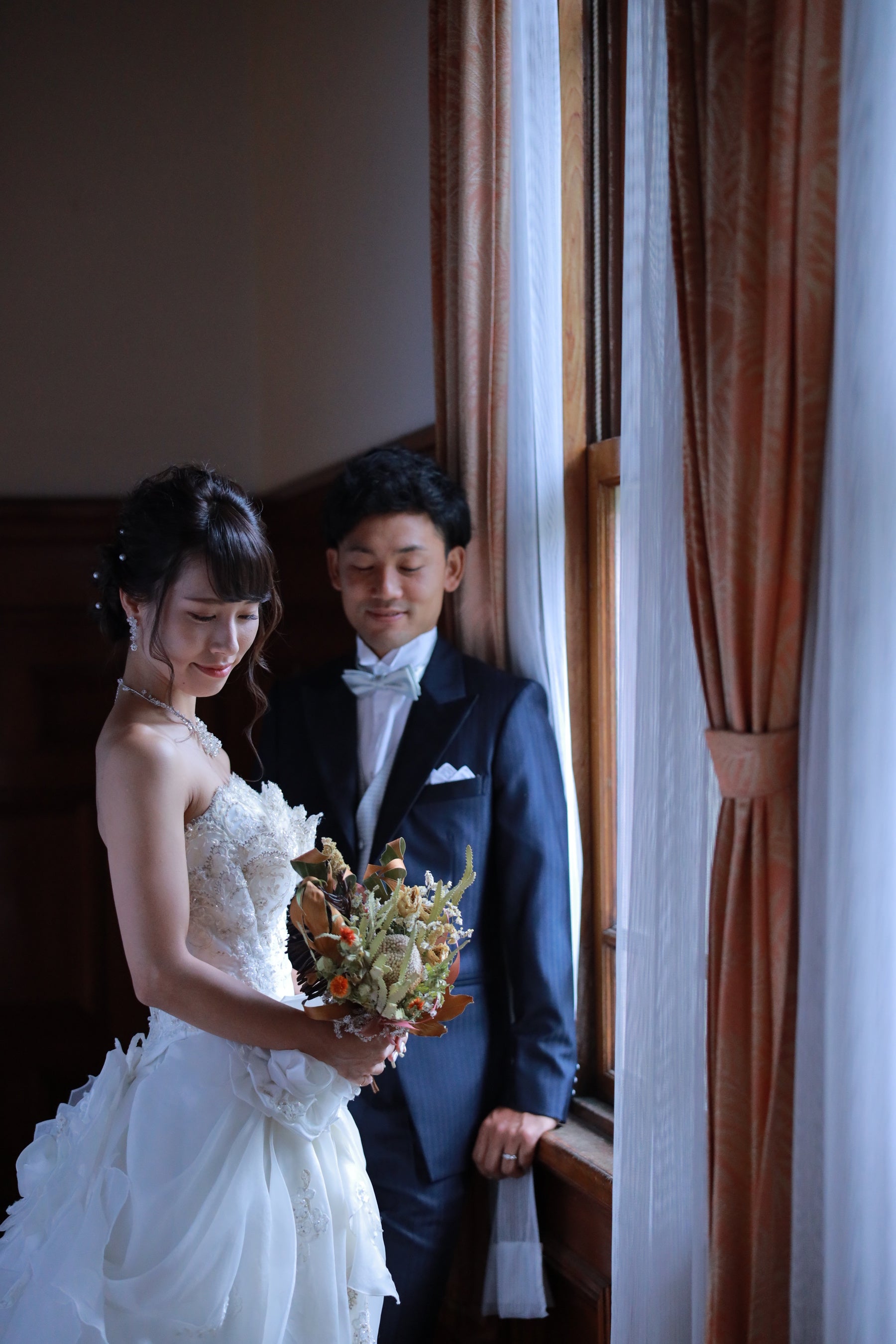 光を柔らかく受け止める上質な素材の衣裳をセレクト。