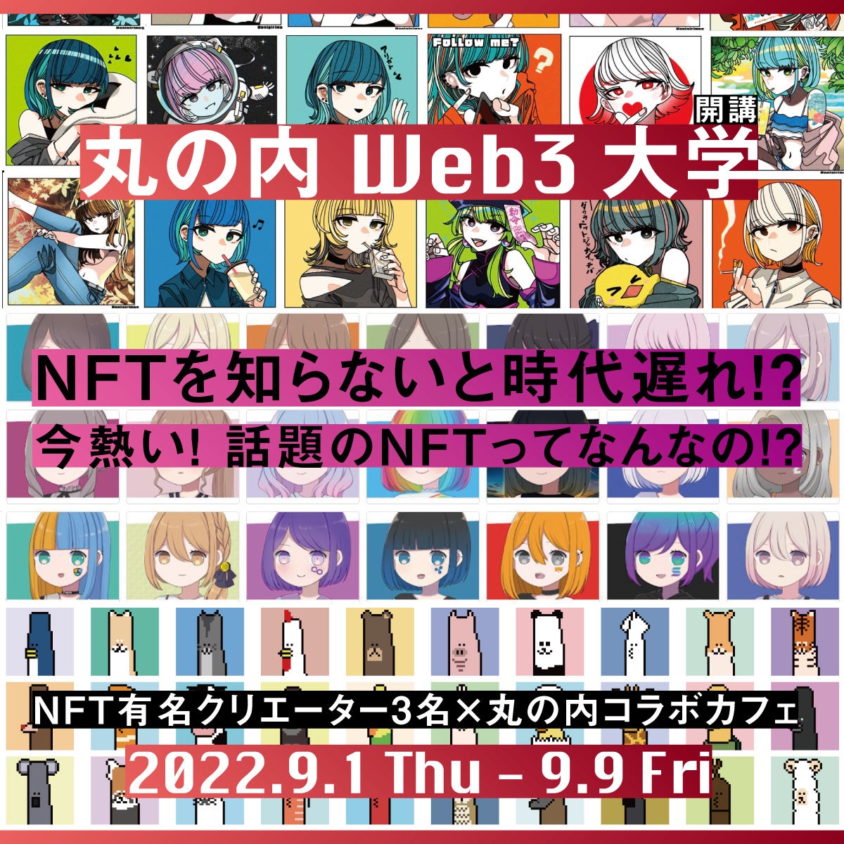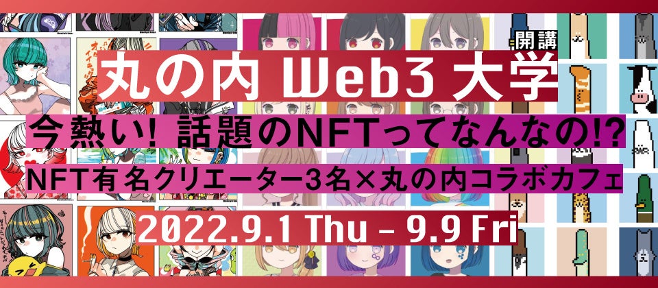 待望の「丸の内Web3大学」がついに丸の内で開講します!3名の有名NFTクリエーターとのコラボカフェや、IVS Crypto協力による豪華ゲストとのトークイベントなど様々なコンテンツを用意しています!