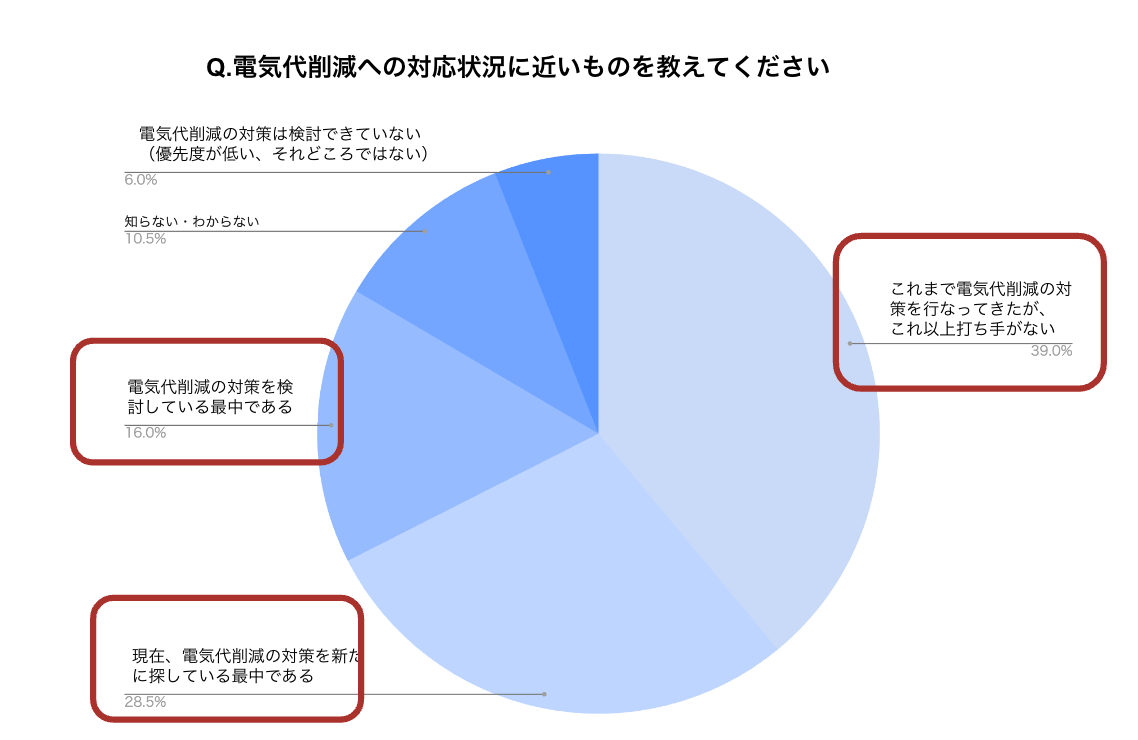 電気代削減への対応状況として、83.5%が「対応してきたがこれ以上打ち手がない」および「対応方法を検討している最中」と回答し、多くの企業が対応を検討している状況であった