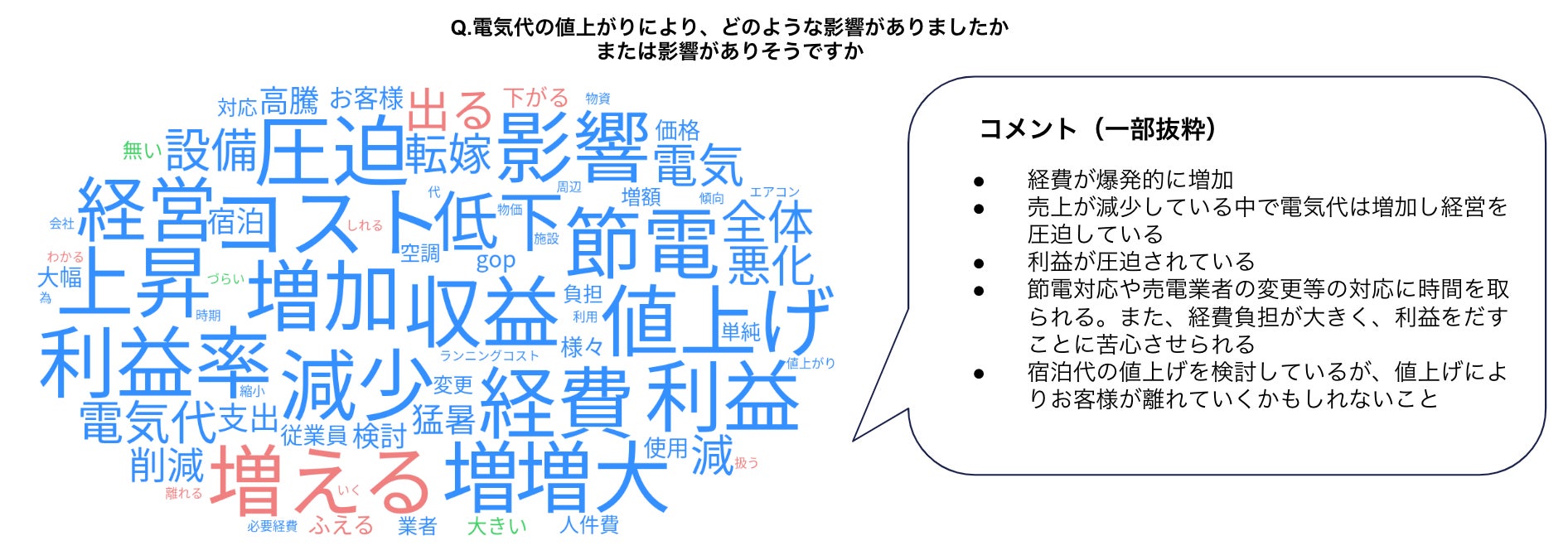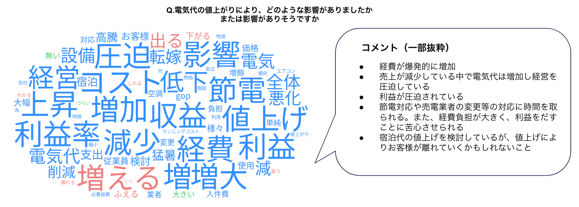 電気代の値上がりによる影響として、「経費・利益の圧迫」「経営の圧迫」「宿泊代の値上げの検討」「節電の対応に時間が取られる」との回答が多かった