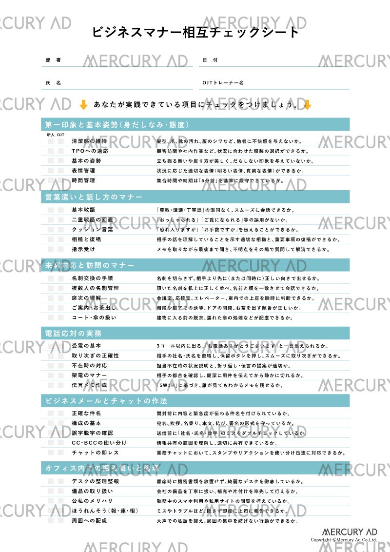 【株式会社マーキュリー・アド】(本社:大阪市北区、代表取締役:徳山敬祐)は、新入社員の指導に悩むOJTトレーナーやメンターに向け、お互いの基準をすり合わせ、ストレスフリーな新人教育を実現する『ビジネスマナーチェックシート』を公開いたしました。
