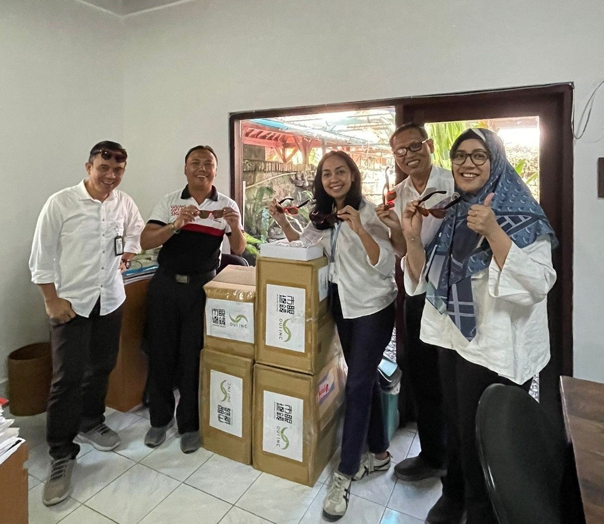 OUI Inc.は、インドネシアの眼科医療僻地で治療を必要としいる方々のために活動を続けているJohn Fawcett Foundation/Udayana Universityと協働し、離島や僻地でのSECを活用した支援活動・共同研究を進めています。今回寄贈されたサングラスやメガネフレームは、こうした地域の方々の白内障手術など治療後の目を保護するために活用されます。