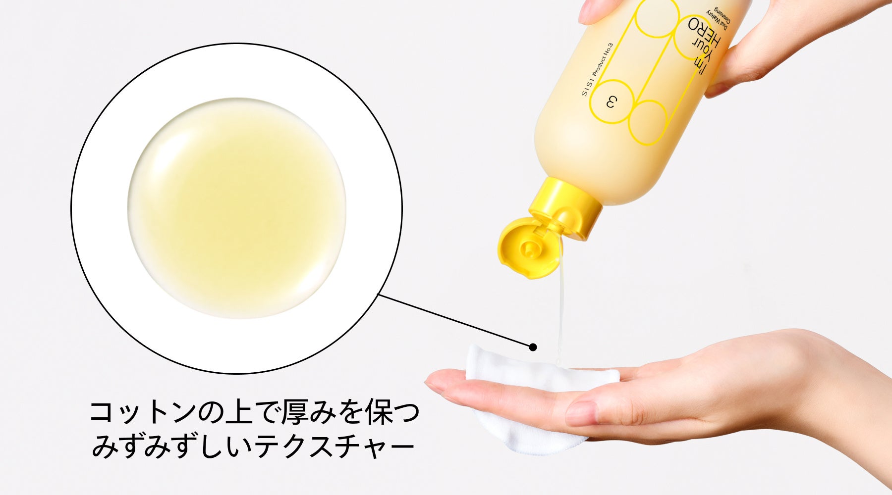 コットンに含ませても肌との間にクッション性を持たせる、厚みのあるテクスチャーにこだわりました。ベタつきを感じないしっとりとした使用感で、心地よくケアできます。