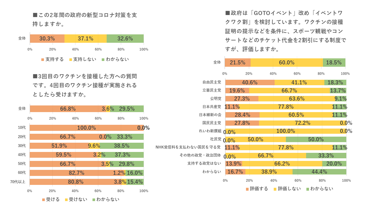 - 欧米など106の国や地域からの入国拒否の解除、「イベントワクワク割」の検討、感染症法上の位置づけを「2類相当」から「5類相当」に引き下げる質問に関しては、自民党支持層は賛成が多い、もしくは賛否拮抗だが、同じ与党でも公明党支持層では反対など評価しない人が多かった。年代別に見ると、70代以上で上記3つを支持する人は、他の年代に比べ明らかに低かった。感染による重症化のリスクが多いことが表れているといえる。