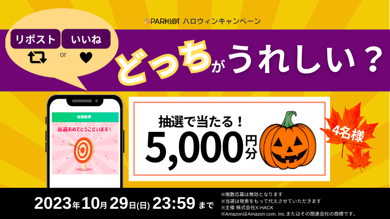 ■企画内容 ●キャンペーン期間: 2023年10月9日(月)〜10月29日(日)23:59 ●応募方法: ①パークロット公式X/Twitter( https://twitter.com/PARKLoT1 )をフォロー ②キャンペーンの景品にもらってうれしいと思うのが 「Amazonギフトカード」ならリポスト、「QUOカード」ならいいね で応募完了 ※ キャンペーン投稿に選んだ理由を返信すると、当選率がアップします ●賞品: AmazonギフトカードもしくはQUOカードPay 5,000円分 × 4名様 ●結果発表: 当選者のみPARKLoT公式X/Twitterアカウントよりお知らせ ※ 公開アカウントのみ対象となります ※ DM送信が許可されているアカウントのみ対象となります(「メッセージリクエストを許可するアカウント:全員」に設定ください) ●賞品発送: 当選者へDMにてAmazonギフトカードもしくはQUOカードPay 5,000円分を送付いたします。 ●キャンペーンに関するお問い合わせ先 PARKLoT キャンペーン事務局 https://www.park-lot.com/contact 営業時間 10:00~18:00(土日祝日を除く) ※お問い合わせの際は、1.キャンペーン名 2. twitterユーザー名(例: @●●●)をあわせてご記入ください。 |