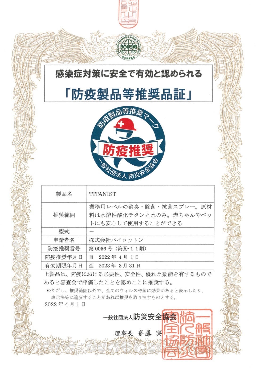 株式会社パイロットン(本社:東京都千代田区/代表取締役:栗田浩行)が販売展開する製品「TITANIST(チタニスト)」が、防疫推奨品認証制度に基づき、一般社団法人防災安全協会から『防疫製品等推奨品』としての認証を取得しました。