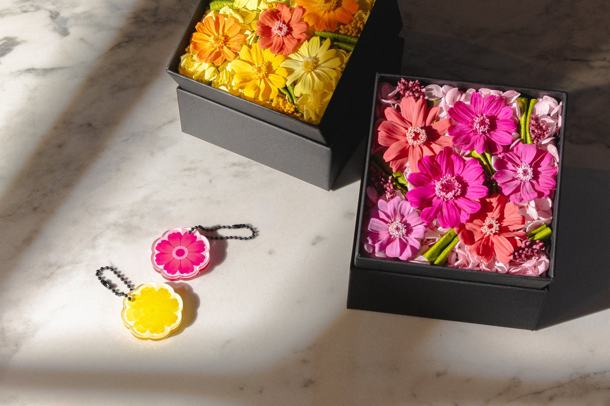 さらに、2026年2月9日(月)から3月15日(日)までの期間、ニコライ バーグマン フラワーズ & デザイン店舗限定のバレンタイン・ホワイトデーキャンペーンを実施いたします。期間中、スプリングコレクション2026のアイテムをご購入いただいたお客様に、今季の主役であるジニアをモチーフにしたアクリルキーチャームをプレゼント。本コレクション限定のオリジナルアイテムです。