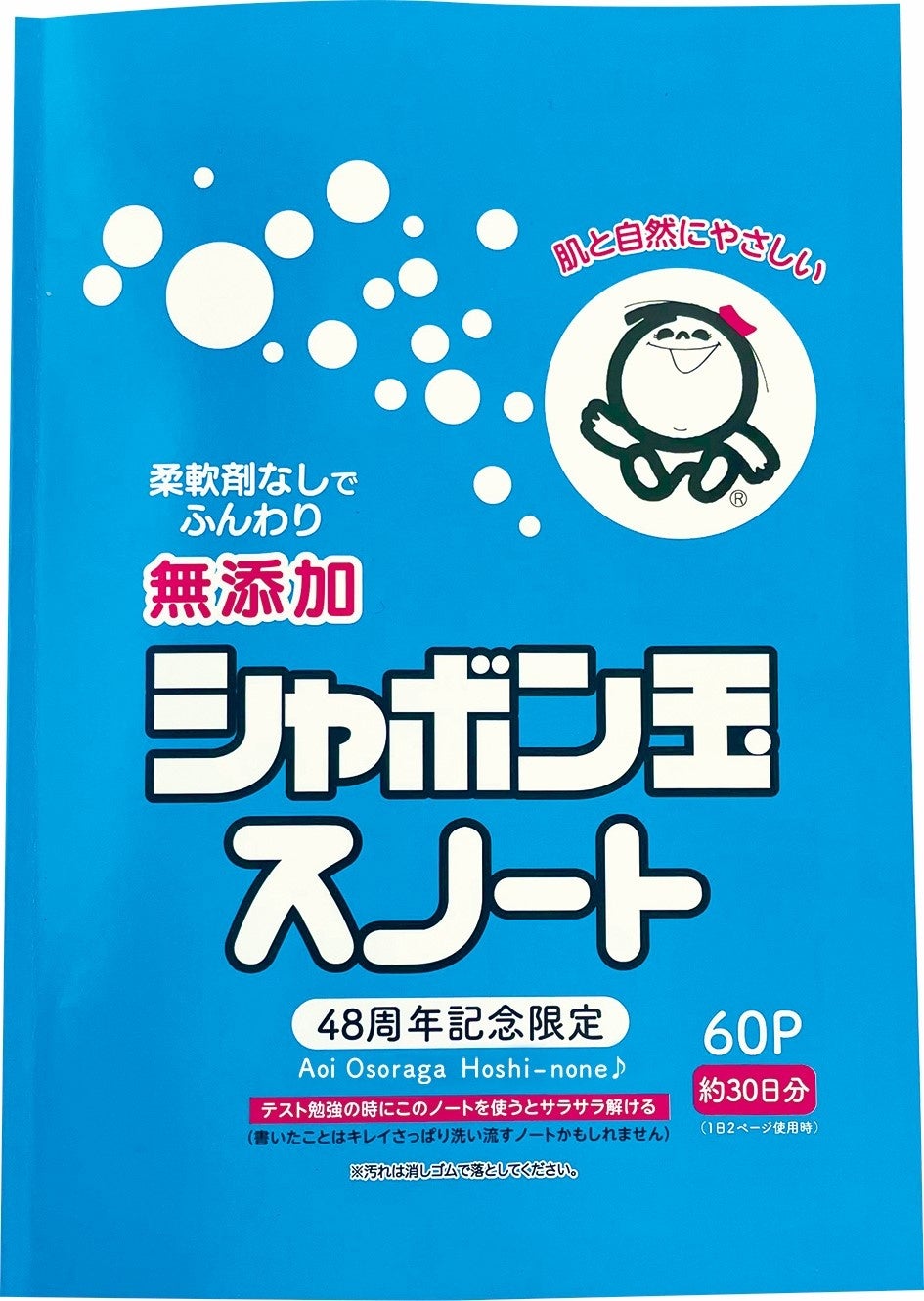 A5サイズの48周年アニバーサリーノート「スノート」も数量限定で発売します。公式SNSで「粉石けんスノール」のパッケージ柄のノート工作を紹介したところ、商品化希望の声が多数あり、お客様の声を反映して実際に商品化いたしました。2022年5月1日(日)から通信販売にて発売開始。税込198円。