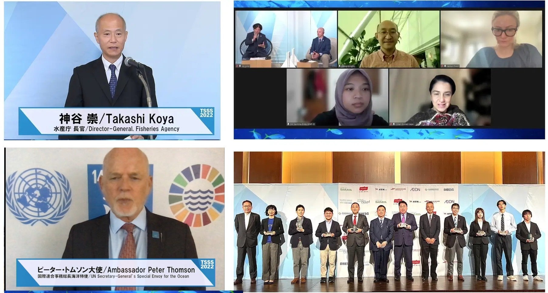 神谷崇・前水産庁長官の基調講演(上段左)、中国、メキシコ、インドネシアなどからオンラインでの同時配信(上段右)国際連合事務総長海洋特使 ピーター・トムソン大使の基調講演(下段左)第4回ジャパン・サステナブルシーフード・アワードの授賞式(下段右)