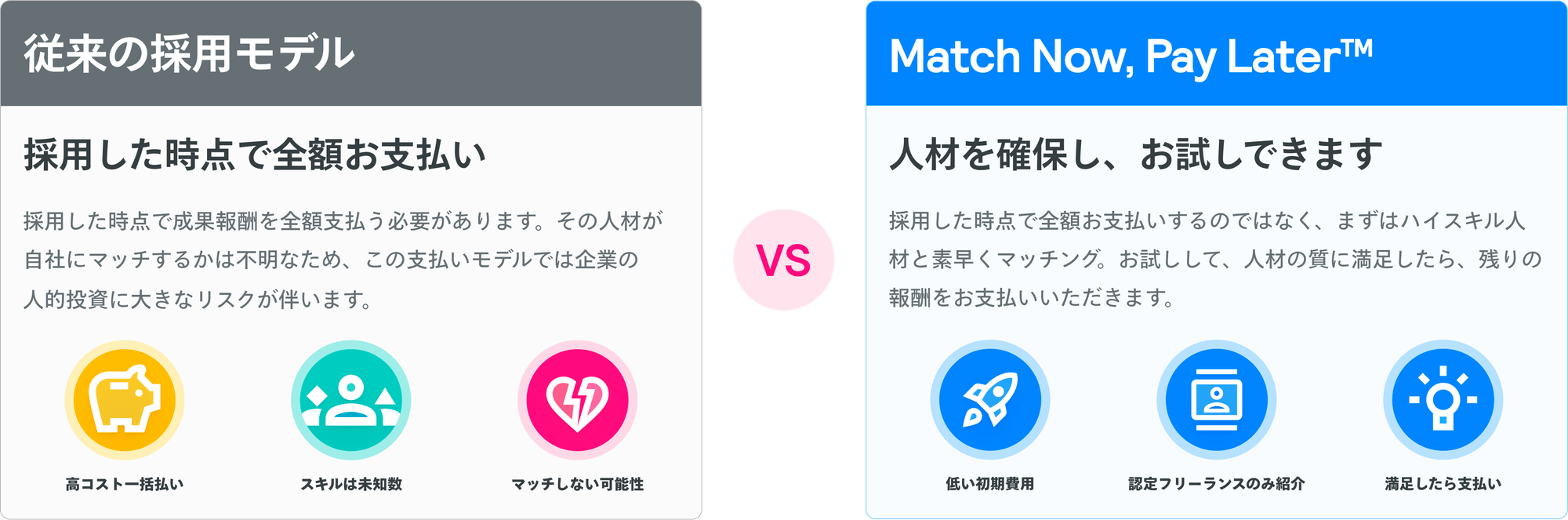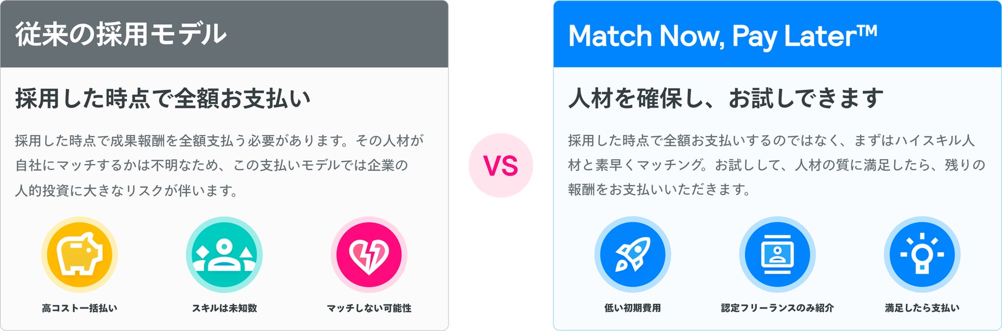 採用あるあるの「ミスマッチ」「コストリスク」をお試し後払いの「MATCH NOW PAY LATER(TM)」で解決
