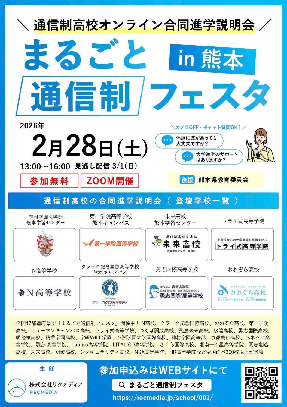 株式会社リクメディアは、通信制高校・サポート校の学校説明をまとめて視聴できる合同説明会「まるごと通信制フェスタ2026」を2026年2月14日から3月1日にかけて開催する。対象地域は全国47都道府県となり、参加対象は中学生や高校生、中学校の教職員や保護者など。参加は無料で、事前申込が必要となる。