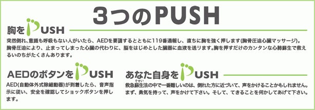 2008年より、大阪ライフサポート協会が推進し、日本心臓財団が支援してきた“PUSHプロジェクト”は、心肺蘇生の中でもっとも重要な「胸骨圧迫」と「AEDの使用法」を多くの方に学んでもらうことにより、倒れた人を前にしたとき、胸骨圧迫とAEDの使用ができる勇気と知識を持ち、心臓突然死からひとりでも多くいのちを救うことを目的とした運動です。大阪から始まった活動は全国に広がり、現在では13箇所の地域コア団体(各地域でPUSHプロジェクトに賛同し、活動の輪を広めている団体)が積極的にその思いを広げています。