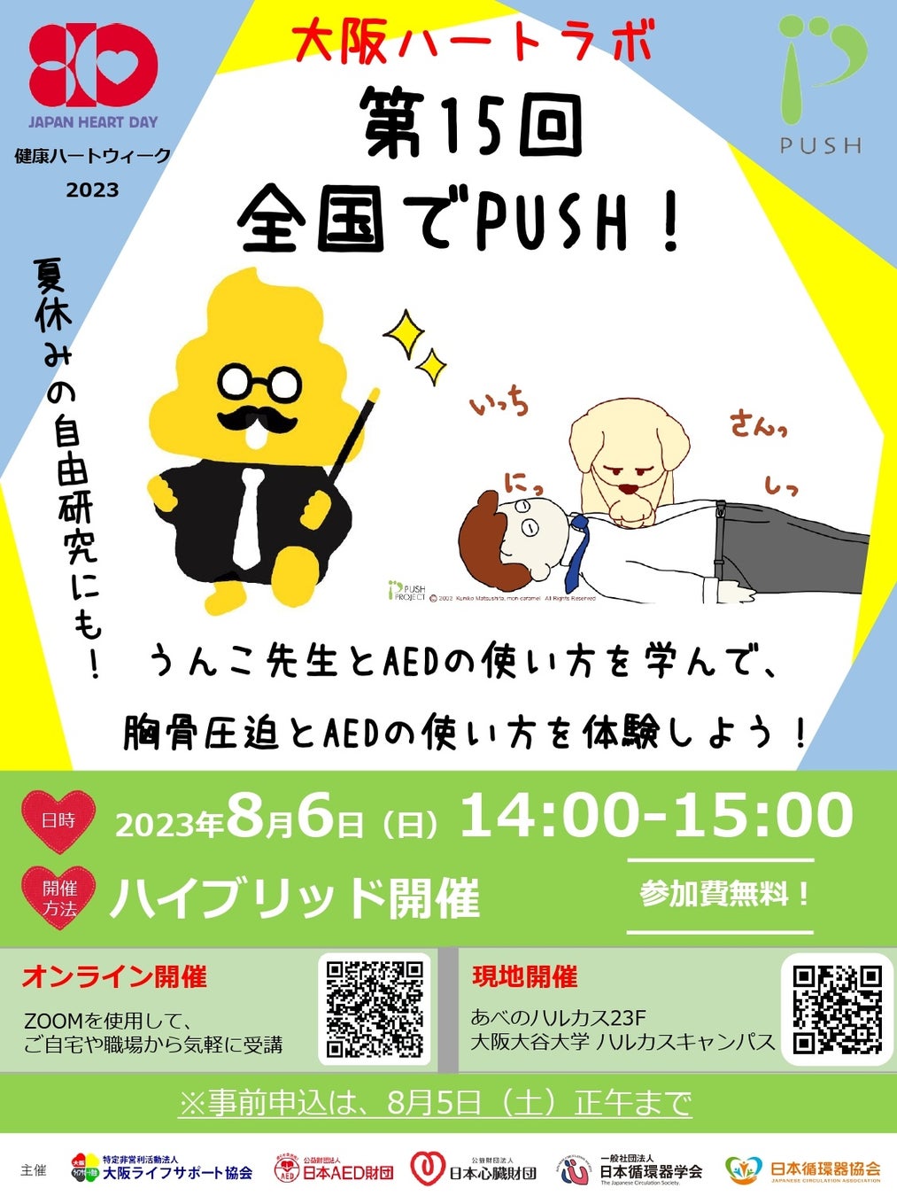 大阪会場およびオンラインでは、上記3団体に日本循環器学会、日本循環器協会との共催によるイベントとして、うんこ先生とAEDを学ぶあべのハルカス開催&オンライン講習を実施するなど、各地で特色のあるコースが展開されます。