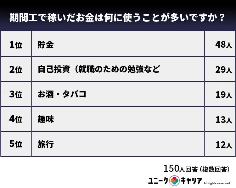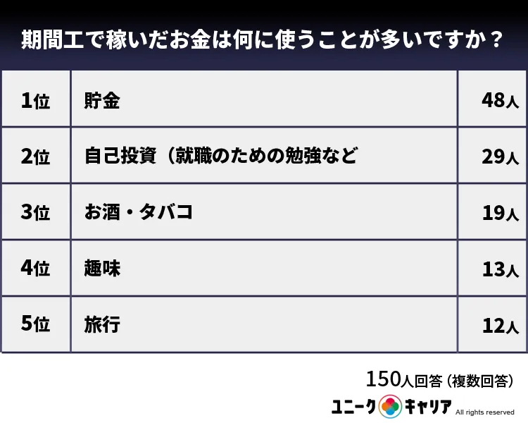 その中で、実際に期間工で働く人にお金の使い道を調査したところ、「貯金」という回答が最も多い結果に。