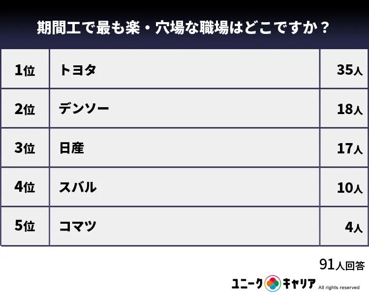 期間工を2社以上経験のある人に「最も楽・穴場な職場はどこか」と調査したところ、1位がトヨタに。2位はデンソー。3位は1票差で日産となった。