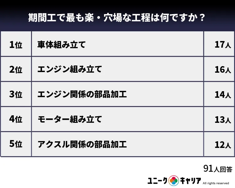 こちらも2社以上の期間工経験者に調査したところ、車体の組み立てが1位に。次いで2位はエンジンの組み立てということで、組み立て関連が楽な工程だという結果に。