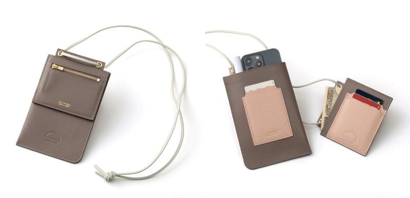 続いて、スマートフォンをスタイリッシュに肩掛けできることで人気の〈スマートWショルダーウォレット〉をご紹介します。手前側のミニウォレットは、紙幣やレシートを収納できるフリーポケットが2つ、背面側にカード室を2室装備。背面側のポーチはスマートフォンだけでなく、リップ等のコスメも併せて収納可能なデザインです。