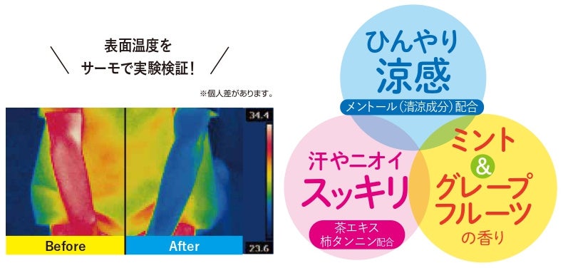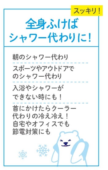 さっと拭くだけ!気化熱とメントール(清涼成分)の涼感効果で、まるで冷たいシャワーを浴びたようにスッキリさっぱり!ひんやり気持ちのいい冷涼感です!