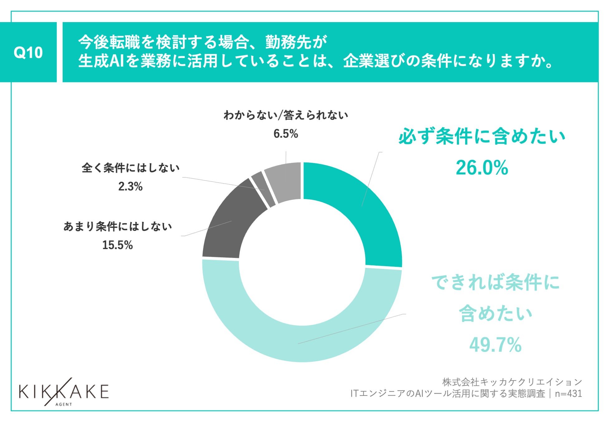 「Q10.今後転職を検討する場合、勤務先が生成AIを業務に活用していることは、企業選びの条件になりますか。」(n=431)と質問したところ、「必ず条件に含めたい」が26.0%、「できれば条件に含めたい」が49.7%という回答となりました。