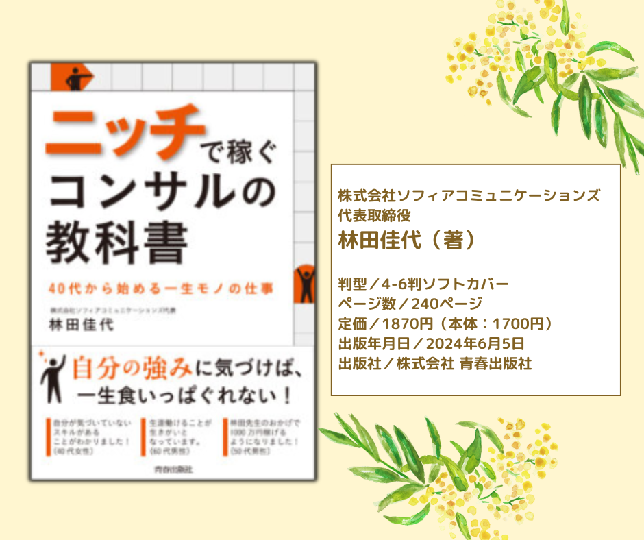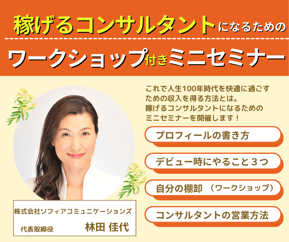 創業塾や顧問(コンサルタント)派遣事業を手がける株式会社ソフィアコミュニケーションズの代表取締役・林田佳代は、長年企業に勤めてきた会社員だからこそ得られてきた知識やスキルを提供することで、稼げるコンサルタントとして活躍する例を、多数見てきました。
