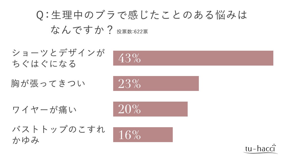 ブラジャーに関して生理中の悩みを質問した結果、回答者の43%が「サニタリーショーツとデザインがちぐはぐになる」、23%が「胸が張ってきつい」との回答がありました。