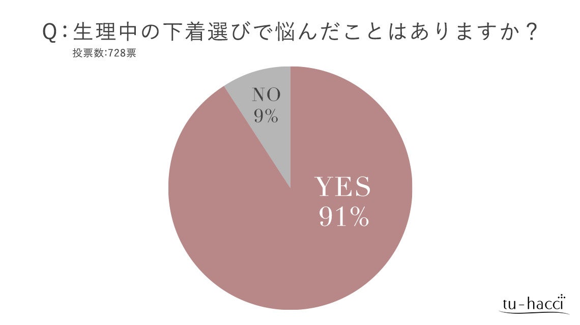 tu-hacciの公式Instagramでアンケート※を取った結果、生理中の下着に関して悩みがあると答えた方は全体の91%。様々なフェムテック商品が出ている昨今でもまだまだ悩みは尽きないようです。
