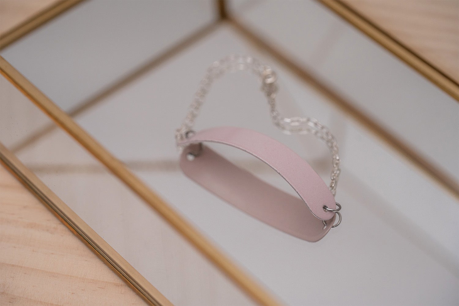 BB1(P) 肌に馴染むように、琺瑯をカーブさせ、焼き切れがアクセントに。細身のチェーンは琺瑯の繊細さを際立たせます。