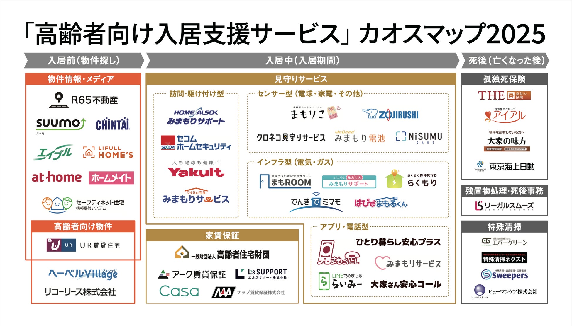 そこで、R65不動産は、高齢者の入居支援に役立つサービスを網羅的に把握し、関係者間での情報共有を促進するため、「高齢者向け入居支援サービス カオスマップ2025年」を作成、公開いたしました。