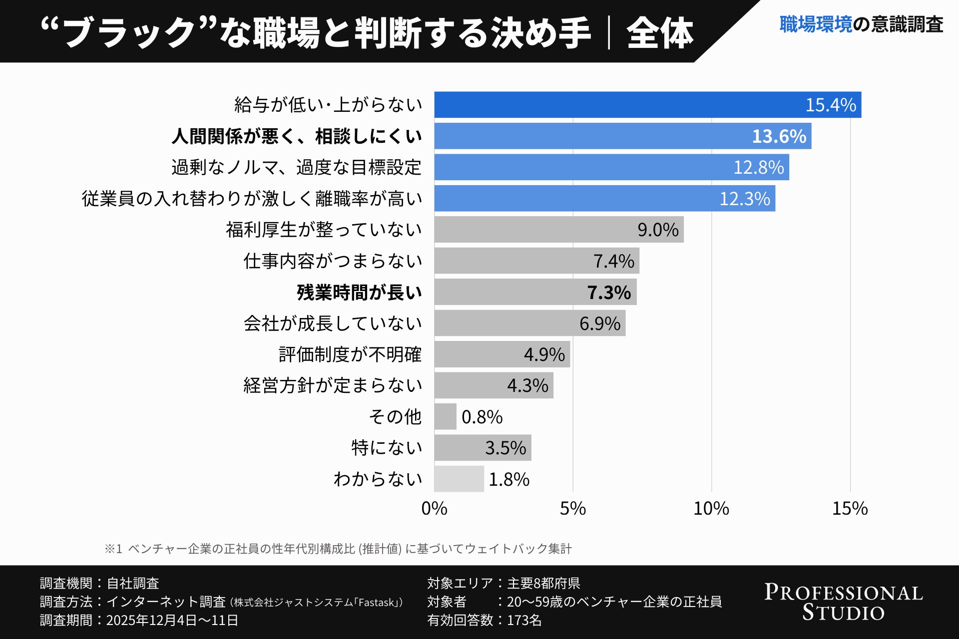 そこで、ベンチャー・中小企業向けのHR総合支援サービスを行うProfessional Studio株式会社( https://professional-studio.co.jp/ )(本社:東京都中央区、代表:市川龍太郎)は、ベンチャー企業における職場環境の価値観を把握するため、主要都府県に在住するベンチャー企業の正社員173名を対象に調査を実施しました。