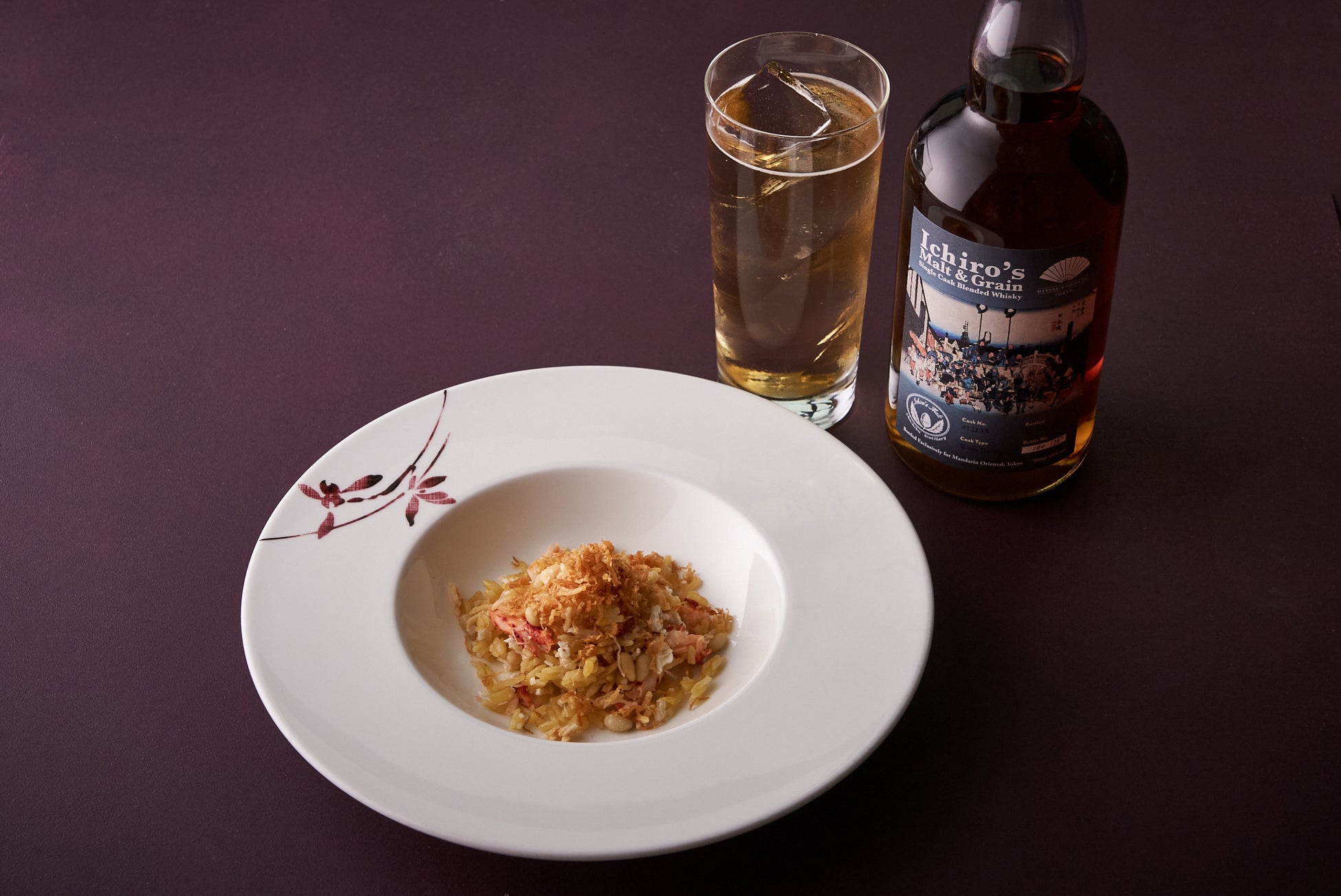 オリジナルウイスキーをハイボールでご提供することで、炭酸の持つ心地よい刺激がウイスキーの持つクローブやナツメグ、スターアニスにも通じる香り豊かなスパイス香を引き出し、炒飯の蟹や干し貝柱の風味をより豊かにします。ハイボールとペアリングすることにより、少し重さを感じがちな炒飯の風味に清涼感を加えます。