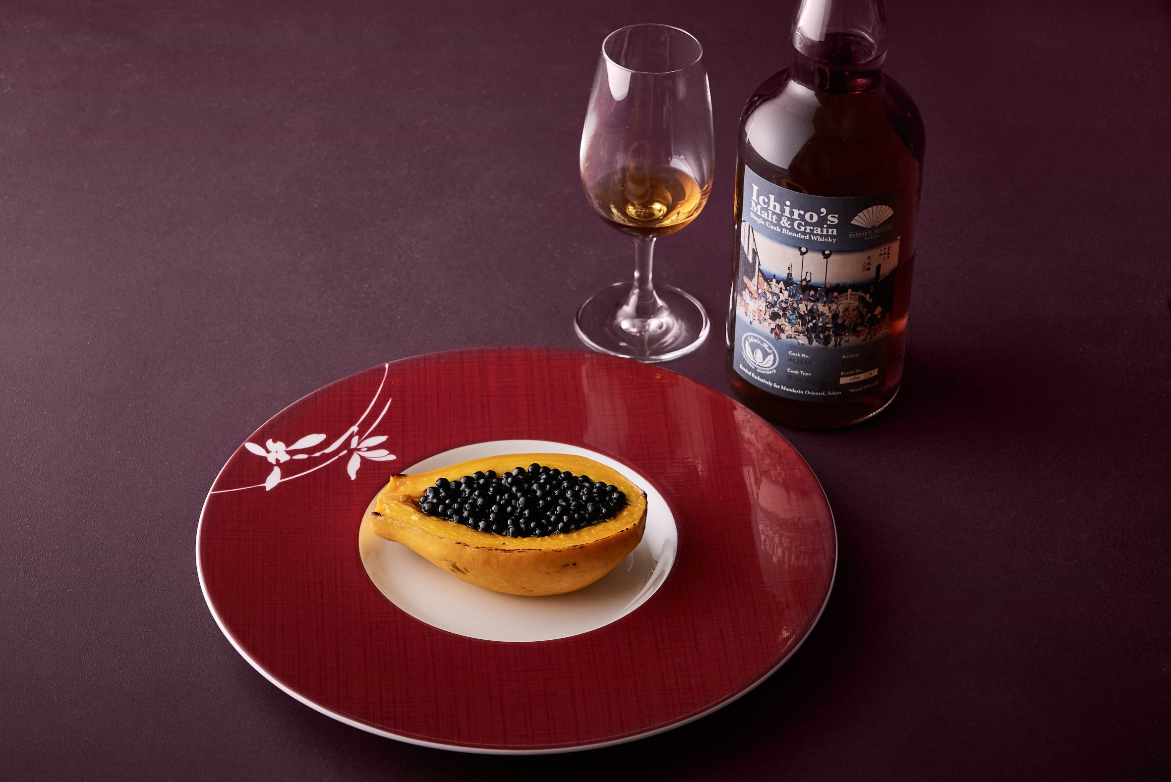 蜂蜜やバニラ、またオランジェットのような柔らかな甘さ、紅茶やマーマレードのニュアンス、ブルーベリーや木苺のようなアクセントを持つオリジナルウイスキーと、じっくりと焼き上げたパパイヤとジャスミンカスタードの至味、豊かな甘みがお互いを引き立てます。「センス」の料理とオリジナルウイスキーの持つ味わいを最大限に引き出し合う、最後の一皿に相応しい贅沢なマリアージュを奏でます。