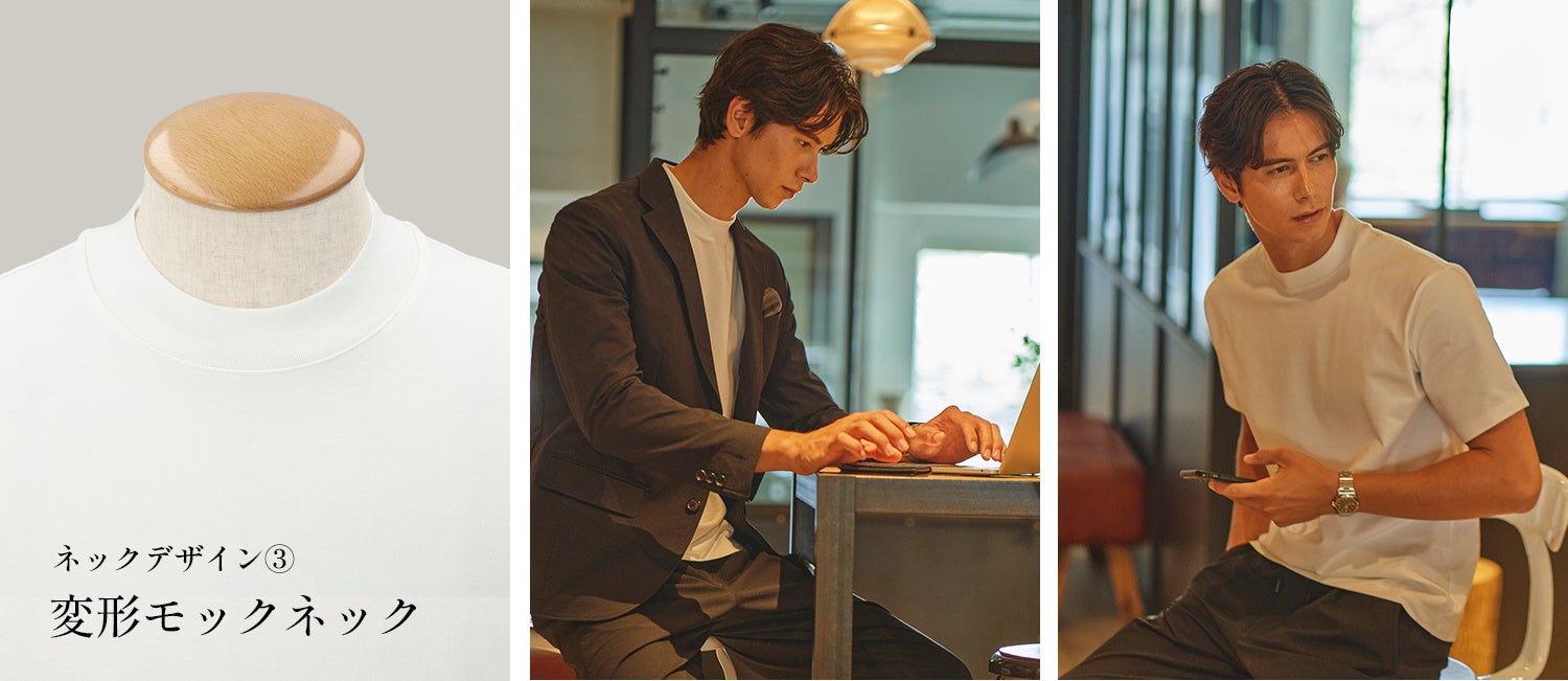ジャケットとの相性が良い変形モックネックは、後ろ襟にかけてリブがより高くなるように設計しています。