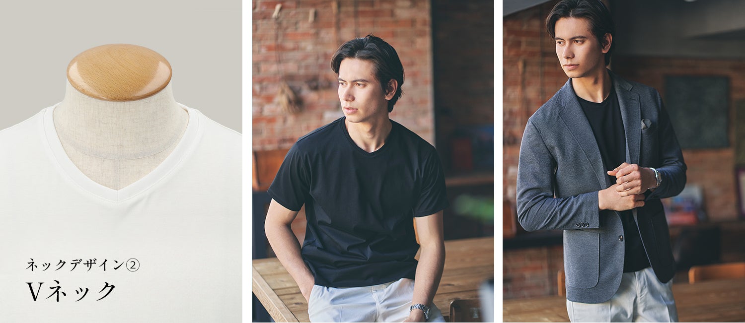 大人っぽさと解放感を演出するVネックは襟元の開きを控えめにすることできっちりとした大人な雰囲気に仕上げてます。