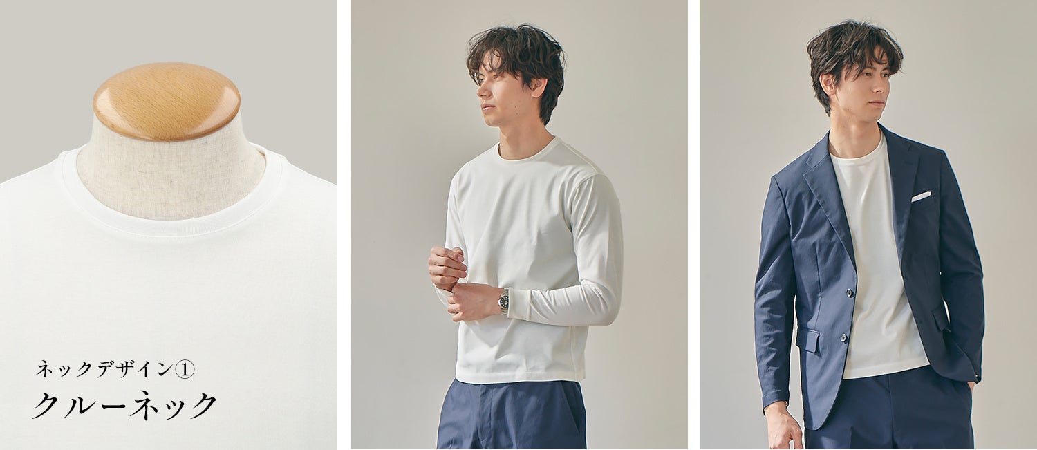 定番のクルーネックはほどよく襟元を詰め、リブを細めにすることでドレッシーに仕上げました。