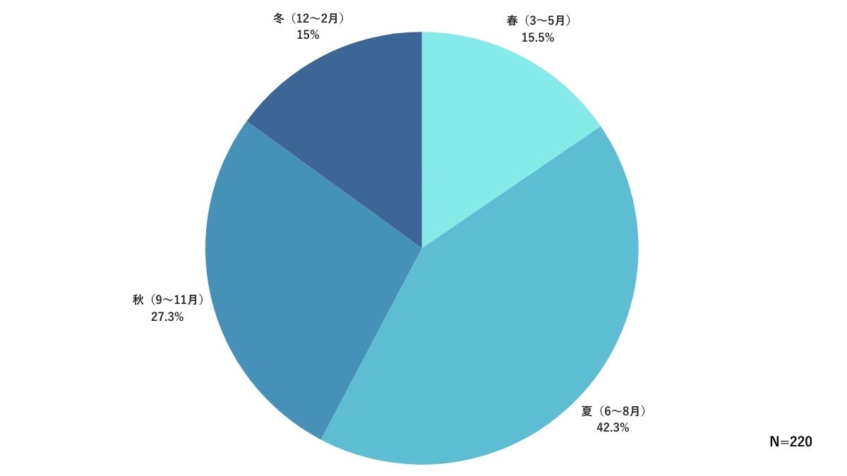 上のグラフは、一棟貸し宿泊施設を利用したことのある全国の男女220人に、「利用シーズン」に関するアンケートを実施し、その割合を示したものです。それぞれの比率をみると、「夏」が最も多い42.3%、つづいて「秋」27.3%、「春」15.5%、「冬」15%の順となっています。