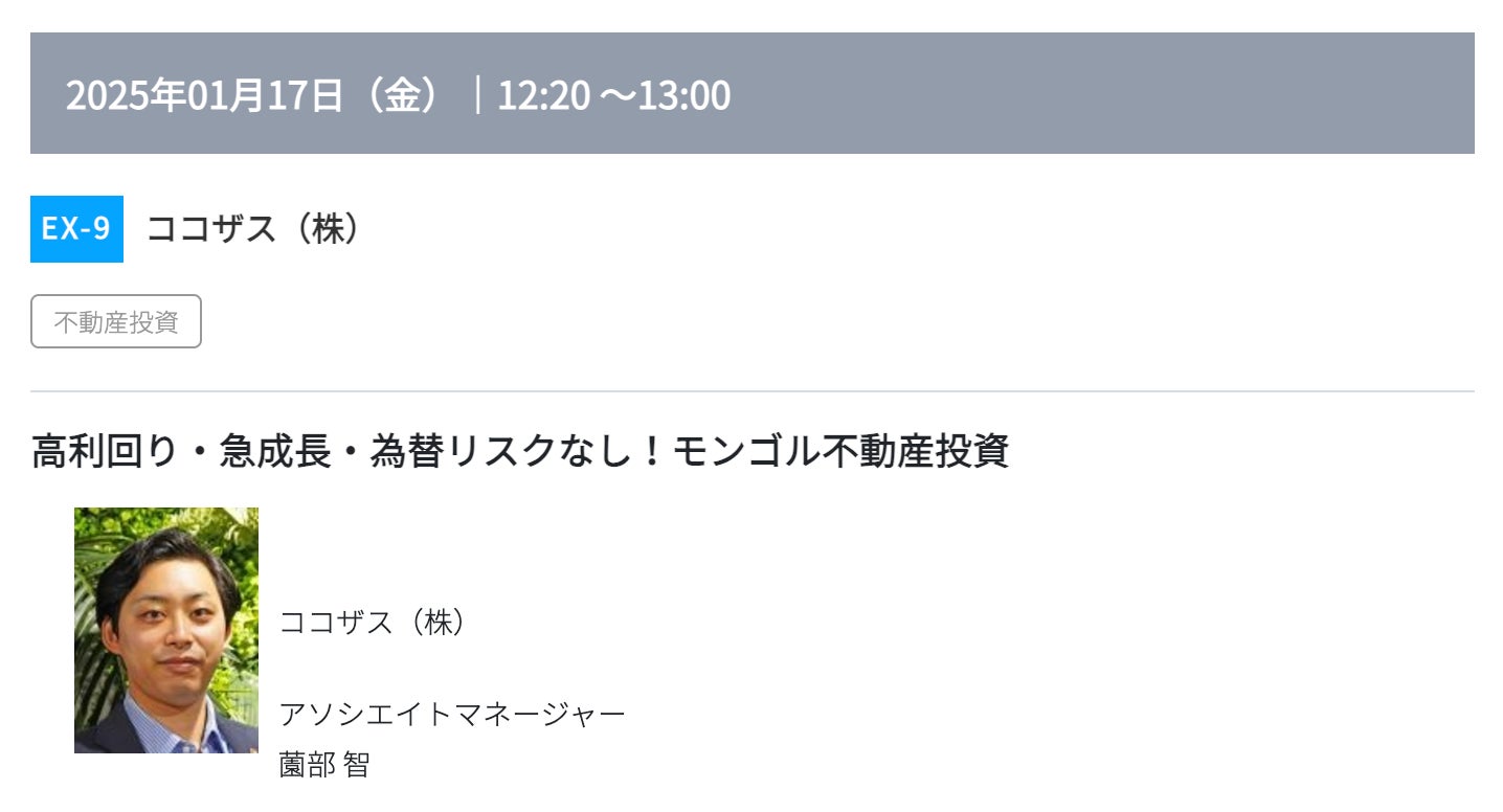 弊社代表取締役CEO安藤義人、コンサルタント薗部智が資産運用セミナーに登壇いたします。新しい別荘投資からモンゴル不動産投資について学ぶことができます。