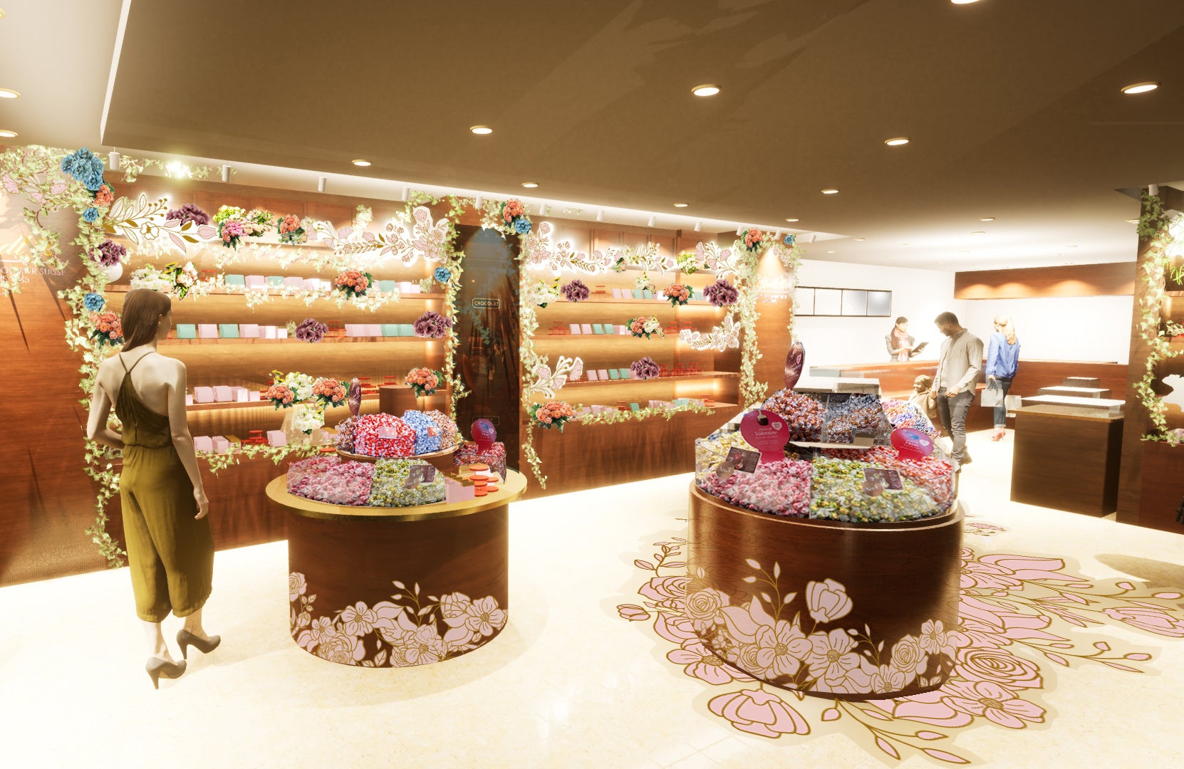 2023年2月2日(木)〜2月14日(火)までの期間限定でオープンする『リンツ ハピネスガーデン 表参道』は、現在発売中の「リンツ バレンタインコレクション 2023(※)」のテーマである“幸せがはじまる風景”の世界観を表現し、幸せのフラワーガーデンをイメージした店舗となっております。華やかな外観からも溢れ出る幸せのオーラを感じながら店内に一歩足を踏み入れると、そこにはたくさんの花々とチョコレートに囲まれた幸せを体感できる空間が広がります。