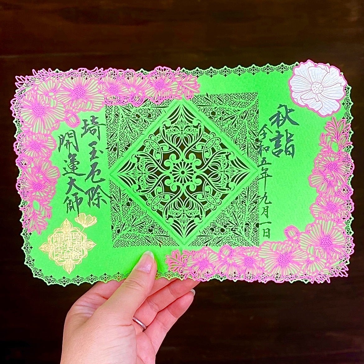 秋限定御朱印はコスモスをモチーフにしました。コスモスの名前はギリシア語の「Cosmos」(宇宙、美しさ)に由来しています。今回の重ね切り絵御朱印は、コスモスの名前が宇宙を表すことから緑の台紙の中央に、仏教で宇宙を表す曼荼羅(花曼荼羅)を繊細な切り絵で表現しました。曼荼羅の周りには、コスモス花の切り絵を重ねております。秋の桜とも言われ、秋を代表する花であるコスモスを切り絵御朱印でお楽しみください。