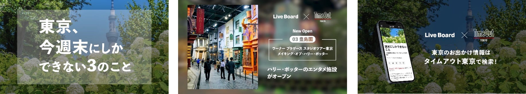 株式会社 LIVE BOARD(本社:東京都渋谷区、代表取締役社長 櫻井 順、以下LIVE BOARD)は、ORIGINAL Inc.が運営する「タイムアウト東京」と共同でLIVE BOARDが所有する関東圏を中心としたビジョン(東京・神奈川・千葉・埼玉の1都3県、62面)を活用し、東京都内近郊のイベントや新店舗オープンなどの最新情報を提案する「東京、今週末にしかできない3のこと」の放映を2023年7月20日(木)より開始します。