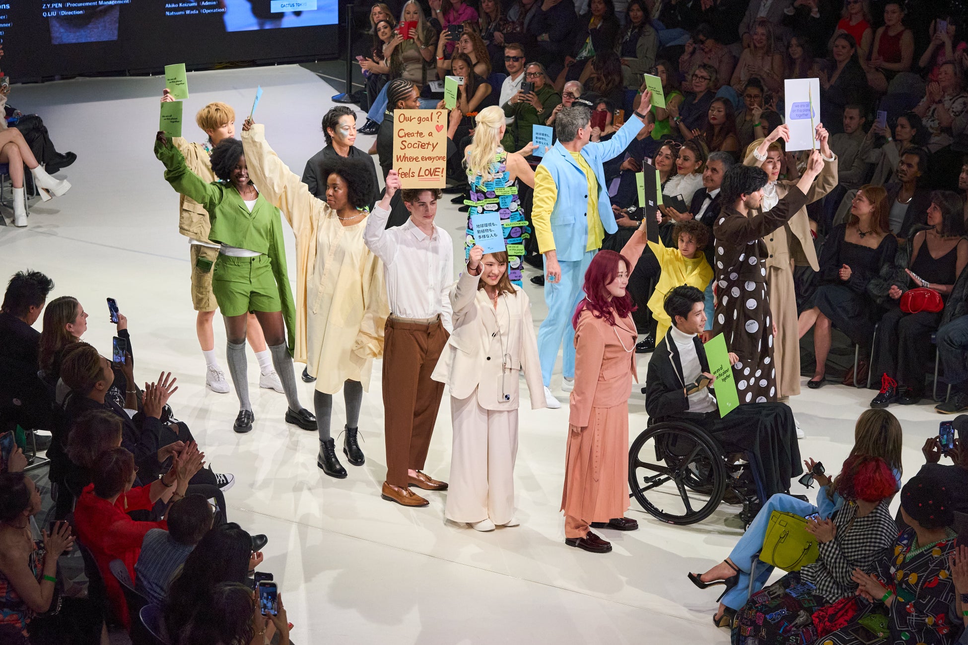 ランウェイではただ美しくウォーキングをするのではなく、作りたい未来に向けた幸せなデモを起こすイメージでモデルは歩き、フィナーレではショーを見ているみなさんへの思いを綴ったメッセージを届けて幕を閉じました。