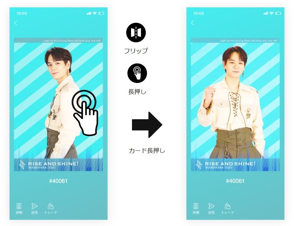 デジタルカードのメリットを最大限に活かしたトレーディングカードシステムで、画面を長押しすると様々なアクションをお楽しみいただけます。