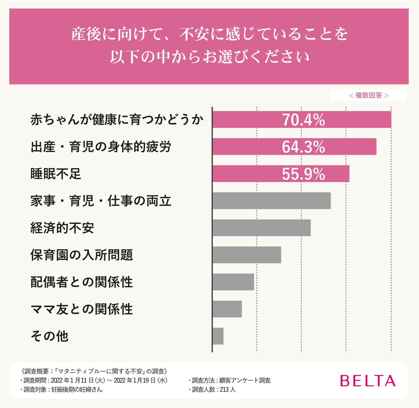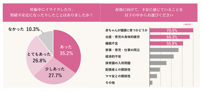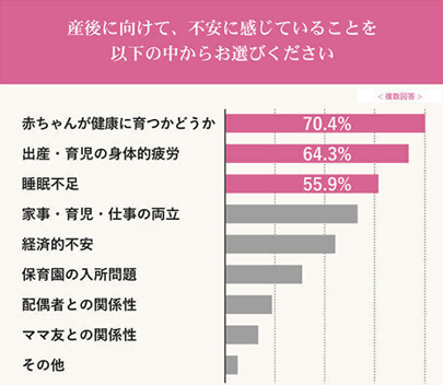 ベルタが妊婦さんを対象に実施した調査では、約70%の方が赤ちゃんが健康に育つかどうかを不安に感じており、また約77%の人が産後うつになる可能性について不安を抱えているということがわかっています。