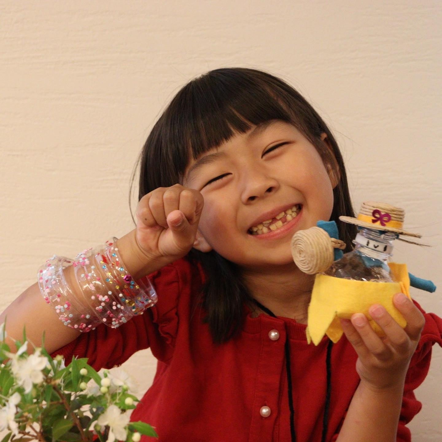 ペットボトルの本体はビーズで飾り付けしたお洒落なブレスレットに、キャップと飲み口を使って可愛いお人形にアップサイクルしてくれました。