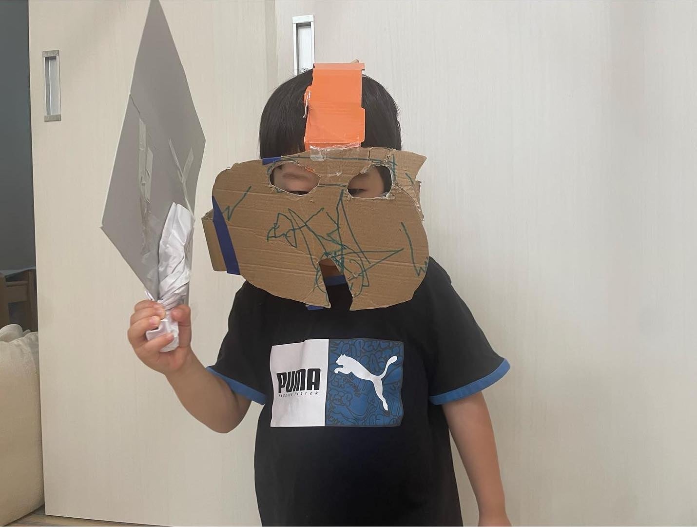 段ボールと厚紙を使って戦士の鎧を作ってくれました。